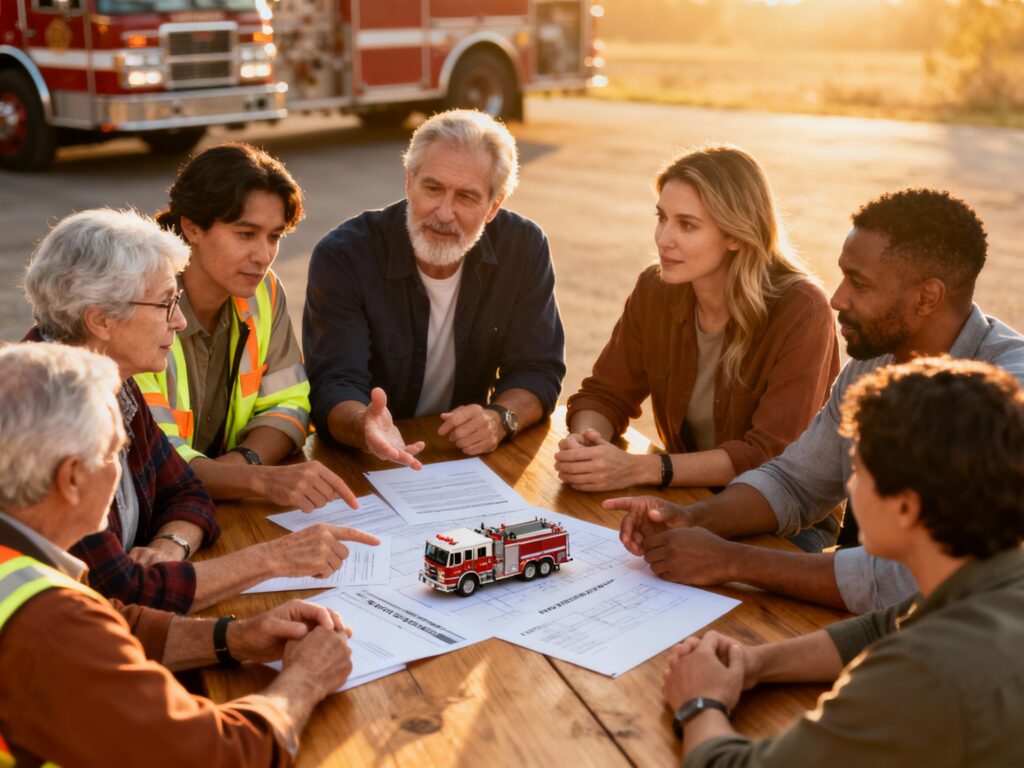 This image represents community safety, featuring a diverse group of people gathered in a neighborhood setting discussing safety measures, with a fire truck in the background symbolizing collaboration between the fire service and the community.